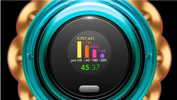 Calcula y categoriza las partículas recogidas, mostrándote en pantalla mientras limpias en modo automático. También muestra la cuenta regresiva del tiempo de ejecución y el modo de energía.